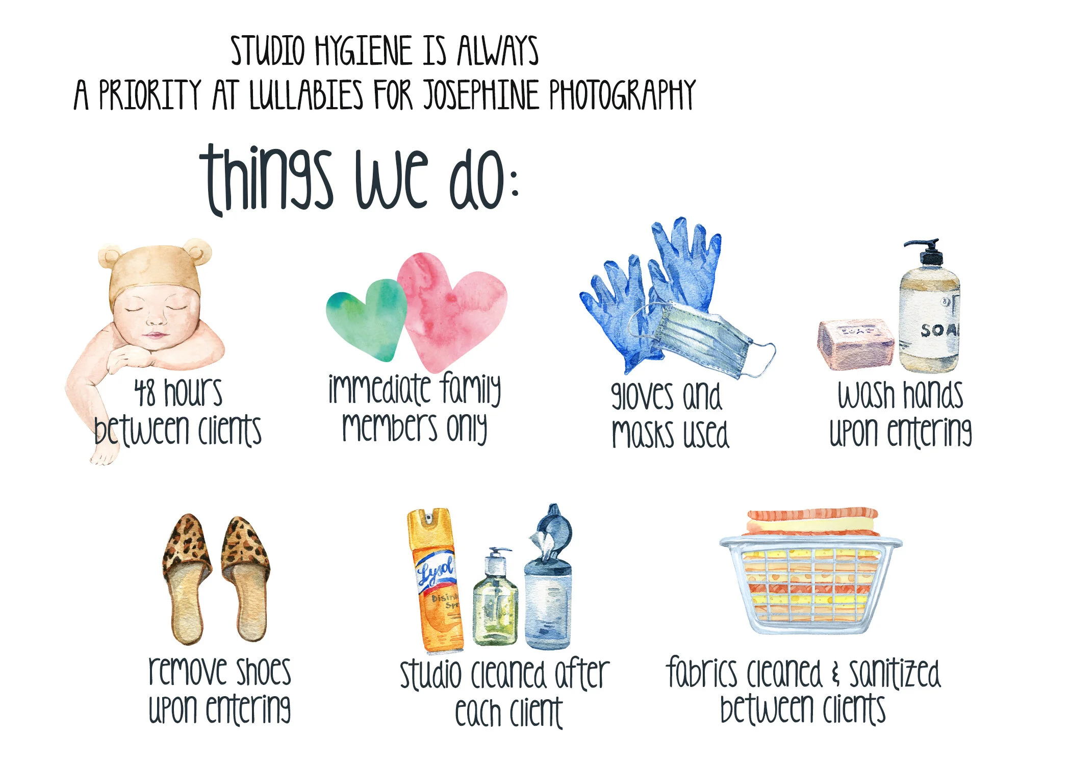 I will work with your baby wearing a mask at ALL times. Clients also need to arrive with a mask and take off their shoes once they come in. I will wear gloves if parents feel more comfortable with me doing so. Posing a baby with gloves is a little bit harder, so I always ask if they feel comfortable with me just using sanitizer often. All the wraps and fabrics that touches the baby will be removed from the studio to be washed and sanitized. Studio is also cleaned after and before each session as well. Studio is equipped with extra gloves for parents that would like to go through samples or albums.